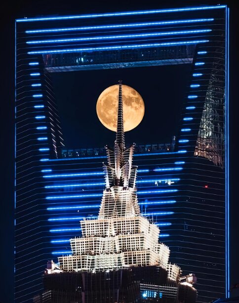 “環金穿月”景象的形成,是天文現象與城市建筑巧妙結合的產物。在特定的時間和角度下,滿月沿著既定的軌道運行,當它恰好運行至上海環球金融中心頂部位置時,便會出現一種獨特的視覺效果。此時,從合適的觀測點望去,空中會呈現出“月亮、環球金融中心、金茂塔尖”三位一體的罕見景象。環球金融中心那高聳入云的建筑輪廓,在月光的映照下顯得格外雄偉壯觀;而金茂塔尖則如同一位優雅的守護者,與環球金融中心相互映襯;滿月則宛如一顆璀璨的明珠,鑲嵌在這兩者之間,構成了一幅美輪美奐的畫卷。這種景象的形成,不僅需要精確的天文計算和時間把控,還需要合適的地理位置和天氣條件。只有在天氣晴朗、能見度高的夜晚,觀測者才能清晰地看到這一奇景的全貌。