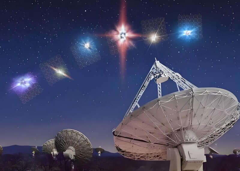 近代射電天文學揭示,來自宇宙的電波訊號是宇宙天體本身發射出來的一種射線,具有極高的能量,輻射粒子的速度接近于光速。當這些宇宙射線進入大氣層外層時,會猛烈撞擊大氣層中的氣體分子,產生其他粒子。這些粒子沖擊到地面時,可用儀器記錄下來,并通過計算機處理得到一個年輪樣子的圖案,即射電圖。射電圖表示射電源電波的強弱分布。例如,著名的射電源天鵝座A的射電圖就是兩個像眼珠似的圓斑,這兩個圓斑并不在星系本身的位置上,而是在星系兩側對稱的位置上,彼此相距30萬光年。天文學家用光學望遠鏡仔細搜索這兩個“眼珠”所在的天區,卻一無所獲。