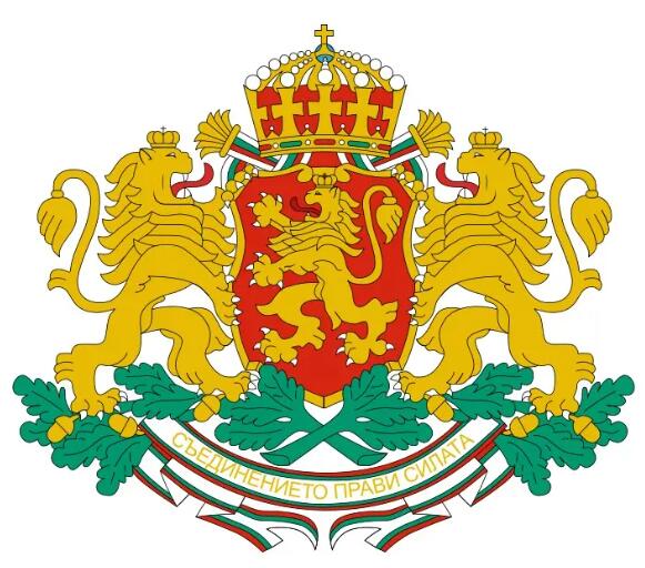 保加利亞國徽是一只金獅直立在深紅色背景的盾牌上,另兩只金獅分立于盾牌兩側,盾牌上是一頂畫有五個十字架的皇冠。雄獅象征主權,表現1876年反抗奧斯曼土耳其人的斗爭。