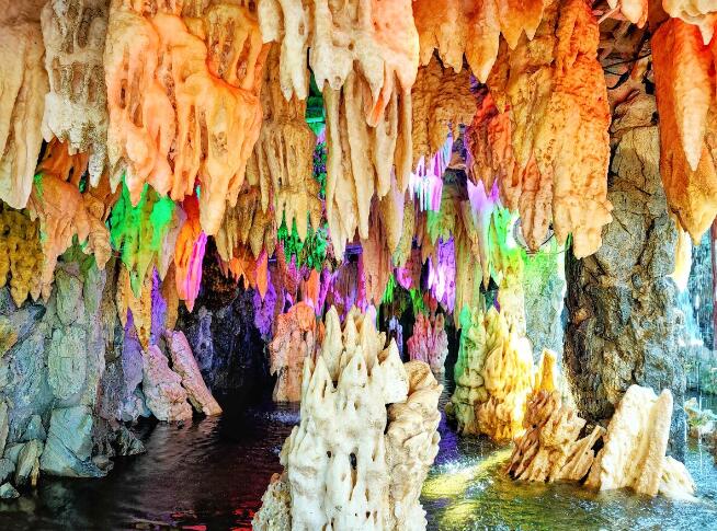 溶洞都分布在石灰巖組成的山地中,石灰巖的主要成分是碳酸鈣,當遇到溶有二氧化碳的水時,會反應生成溶解性較大的碳酸氫鈣;溶有碳酸氫鈣的水遇熱或當壓強突然變小時,溶解在水里的碳酸氫鈣就會分解,重新生成碳酸鈣沉積下來,同時放出二氧化碳。洞頂的水在慢慢向下滲漏時,水中的碳酸氫鈣發生上述反應,有的沉積在洞頂,有的沉積在洞底,日久天長洞頂的形成鐘乳石,洞底的形成石筍,當鐘乳石與石筍相連時就形成了石柱。