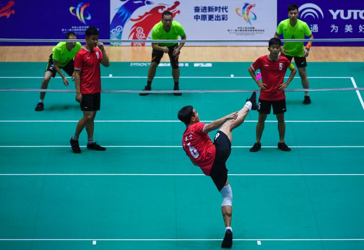團體賽,6個人在場地內互相踢腿,雙方各3個人攻防。每局21分,采用三局兩勝制。在把球踢給對手之前在美國的場地,每個隊在自己的場地最多只能三個人擊球四次。比賽分為兩個階段。第一階段采用小組循環賽,選出前兩名進入第二階段;第二階段采用交叉淘汰。計分方式是贏一局2分,輸一局1分,棄權0分。按分數排名。兩個或兩個以上隊積分相等,凈得者排名靠前;凈贏多的在前列;再次相等,抽簽決定名次。