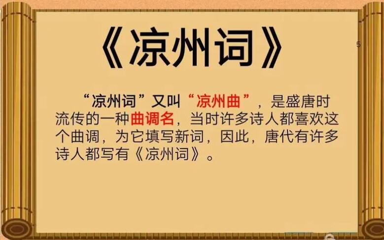 涼州詞(Liangzhou )又稱涼州歌,是為涼州歌所作的一首抒情詩,是唐代流行的曲調(diào)之一名字中的涼州位于中國甘肅省武威市,因地處西部,常年寒冷而得名其代表作是《涼州詞》。